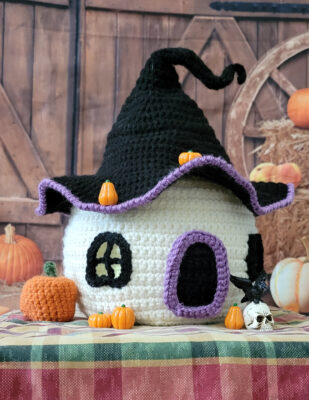 Two adorable crochet pumpkin houses plus a bonus pumpkin hat pattern. The witch house has open windows that you can light up! All made in single crochet.