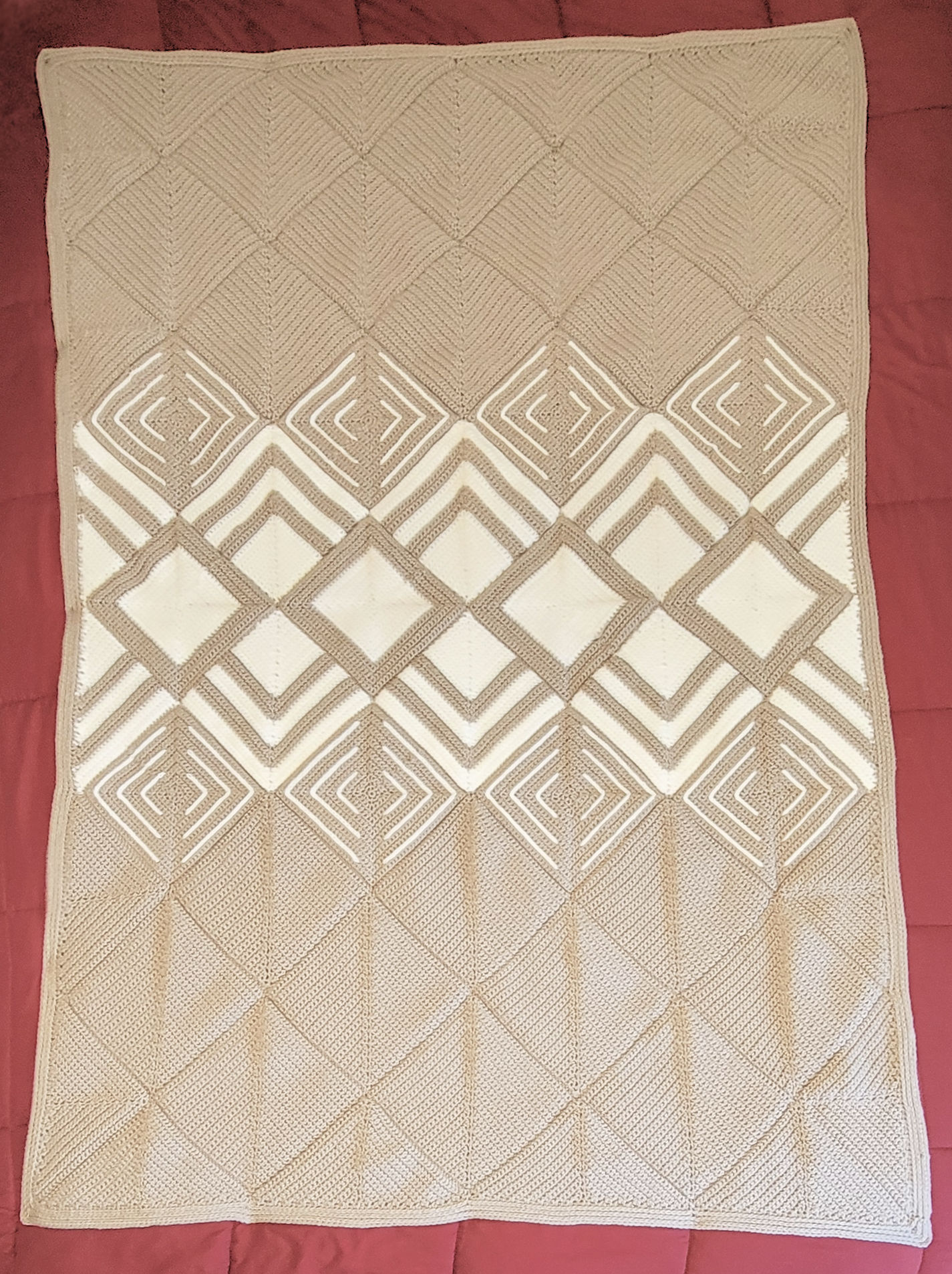 This crocheted blanket pattern was inspired by a quilt I saw and was adapted to be more crochet-friendly. It is worked entirely in single crochet and half double crochet, made in squares and triangles, and then joined together. The finished size is 47 x 67 inches and this is an intermediate project.